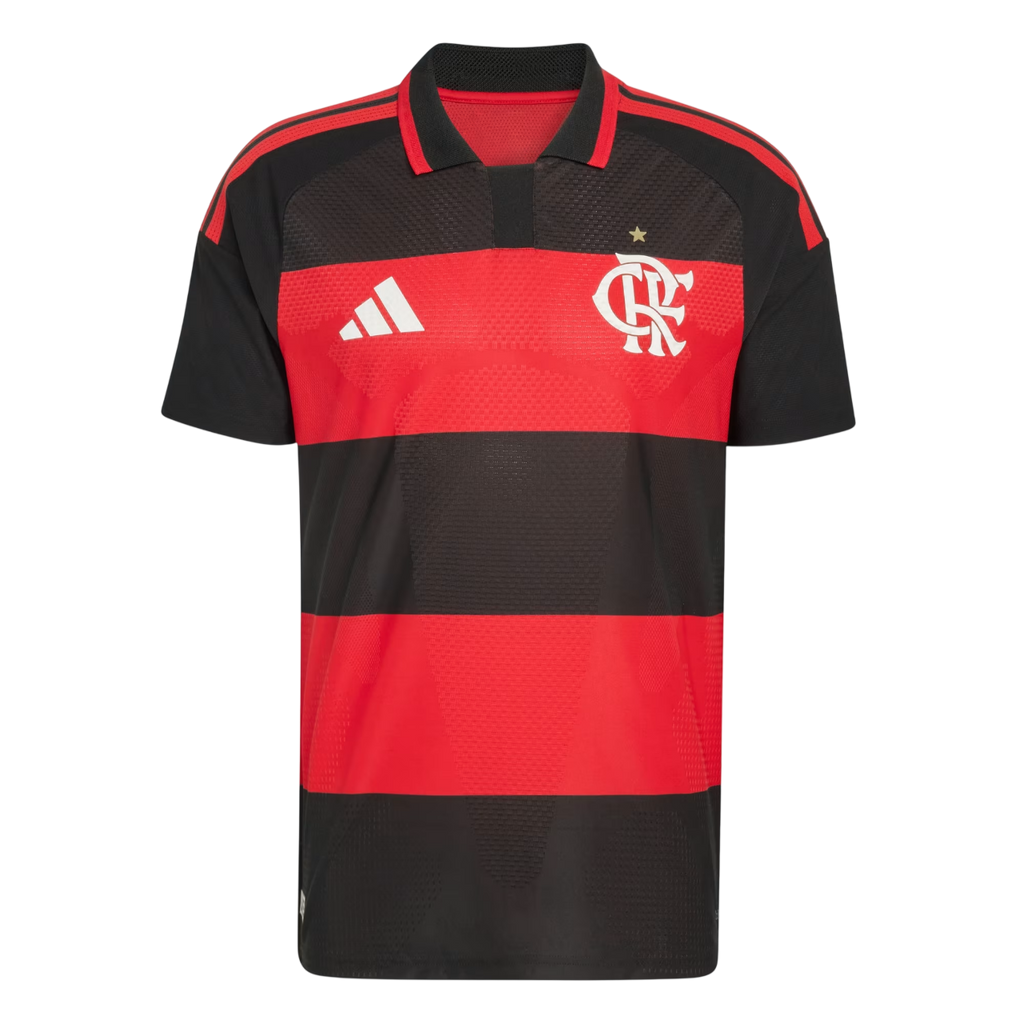 A nova camisa titular do Flamengo para a temporada 2025/26 mantém viva a tradição rubro-negra com as faixas horizontais em vermelho e preto, mas traz um toque de modernidade com acabamento refinado e tecnologia de alto desempenho.